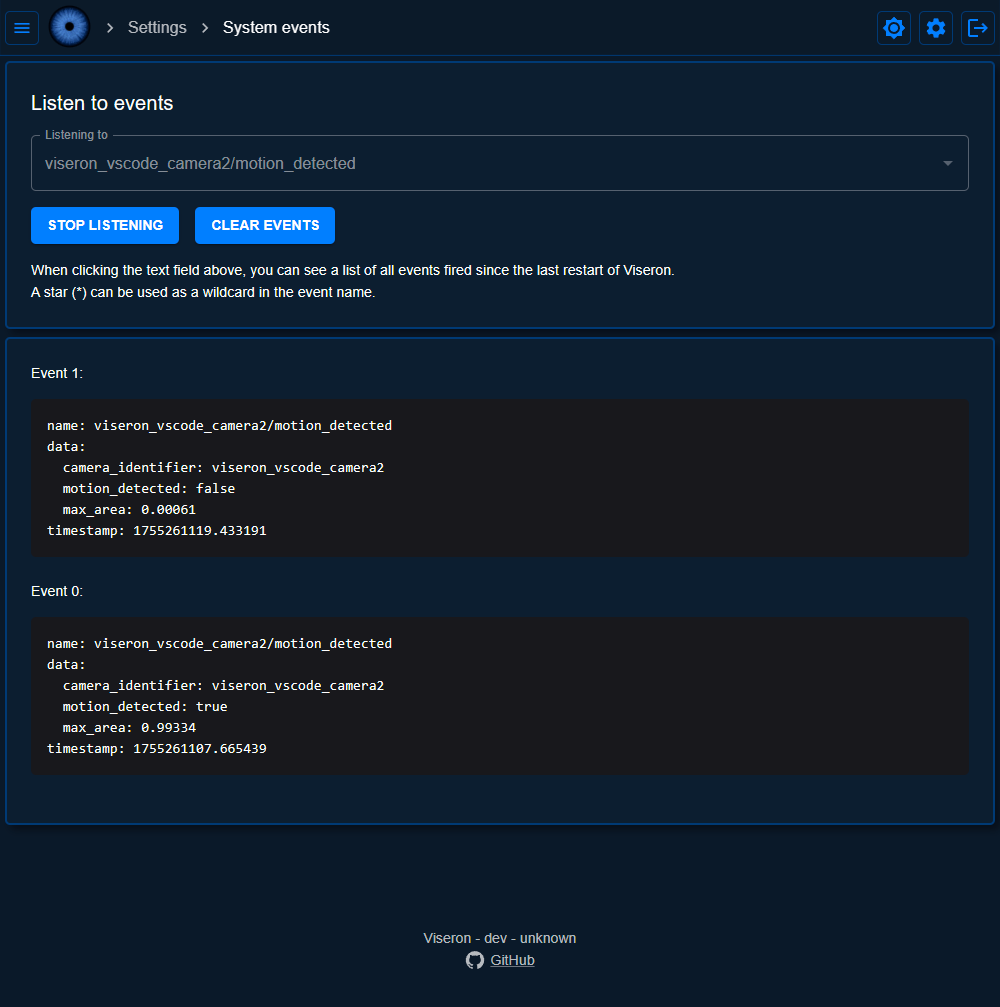 System events are events that are dispatched by the backend for communication between the many components of Viseron, such as when a camera detects motion or an object is detected.